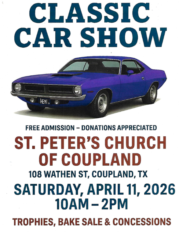 Join us for a Classic Car Show located at St. Peters Church of Coupland! Admission is FREE, and there will be a bake sale, concessions and trophies!